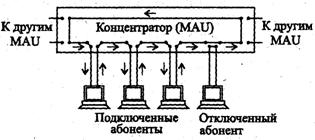 Концентратор (MAU) позволяет централизовать задание конфигурации, отключение неисправных абонентов, контроль за работой сети и т. д. (рис. 7.11).