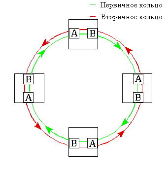 Сеть FDDI строится на основе двух оптоволоконных колец, которые образуют основной и резервный пути передачи данных между узлами сети.