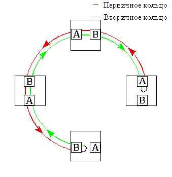 В случае какого-либо вида отказа, когда часть первичного кольца не может передавать данные (например, обрыв кабеля или отказ узла), первичное кольцо объединяется со вторичным вновь образуя единое кольцо.