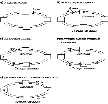 Рис. 7.13 Иллюстрация работы по методу маркерного кольца в сети FDDI