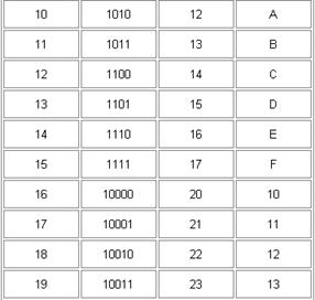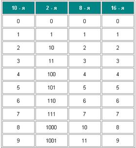 Таблица 2.1 Pначения первых двух десятков целых чисел в 10,2,8,16-ричнных системах исчисления