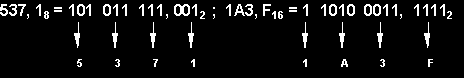 Перевод восьмеричных и шестнадцатеричных чисел в двоичную систему очень прост: достаточно каждую цифру заменить эквивалентной ей двоичной триадой (тройкой цифр) или тетрадой (четверкой цифр). Например, пользуясь таблицей 2.1 можно перевести 537, 1 в восмеричной системе и 1А3,F в шестнадцатиричной системе в двоичный код.