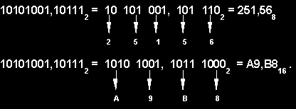 Чтобы, наоборот, перевести число из двоичной системы в восьмеричную или шестнадцатеричную, его нужно разбить влево и вправо от запятой на триады (для восьмеричной) или тетрады (для шестнадцатеричной) и каждую такую группу заменить соответствующей восьмеричной (шестнадцатеричной) цифрой (См. таблицу 2.1).