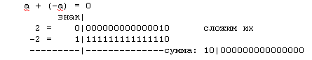 Числа со знаком интерпретируются чуть иначе. Бит [15] считается знаковым: 0 - число положительно или равно нулю, 1 - отрицательно. Отрицательные числа хранятся в виде дополнительного кода: