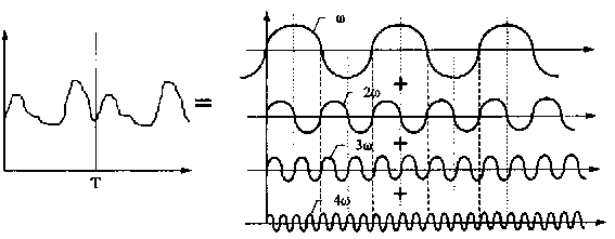 На рис. 4.13 показано как сложный периодический процесс можно представить в виде синусоидальных колебаний различных частот и различных амплитуд.