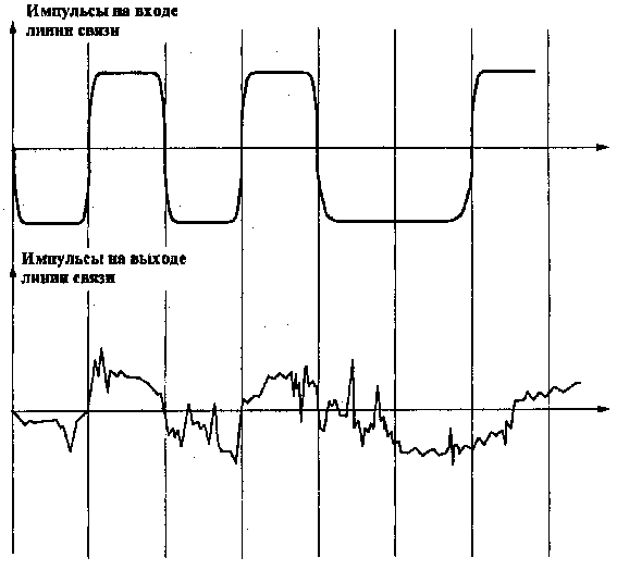 При передаче импульсных сигналов, характерных для компьютерных сетей, искажаются низкочастотные и высокочастотные гармоники, в результате фронты импульсов теряют свою прямоугольную форму. Поэтому на приемном конце линии сигналы могут плохо распознаваться (См. рис. 4.14).
