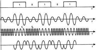 Частотная модуляция. (ЧМ) При частотной модуляции значения логического 0 и логической 1 исходных данных передают синусоидами с различной частотой – f1 и f2 (см. рис. 5.1). Амплитуда сигнала остается постоянной. Этот способ модуляции не требует сложных схем в модемах и обычно применяется в низкоскоростных модемах.