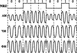 Амплитудная модуляция.(АМ) При амплитудной модуляции для логической единицы выбирается один уровень амплитуды синусоиды несущей частоты, а для логического нуля – другой (см. рис. 5.1). Частота сигнала остается постоянной. Этот способ редко используются в чистом виде на практике из-за низкой помехоустойчивости, но часто применяется в сочетании с другим видом модуляции - фазовой модуляцией.