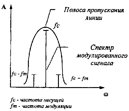 Определим на каких линиях может работать аналоговая модуляция, и в какой степени этот метод удовлетворяет пропускную способность той или иной используемой линии передачи для чего рассмотрим спектр результирующих сигналов. Например, возьмем способ амплитудной модуляции. Спектр результирующего сигнала при амплитудной модуляции будет состоять из синусоиды несущей частоты fс и двух боковых гармоник: