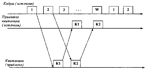 Рис. 6.4 Обмен кадрами квитанциями при методе скользящего окна