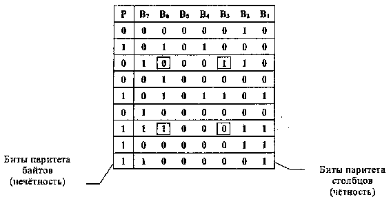 Вертикальный и горизонтальный контроль по паритету представляет собой модификацию описанного выше метода. Его отличие состоит в том, что исходные данные рассматриваются в виде матрицы, строки которой составляют байты данных. Контрольный разряд подсчитывается отдельно для каждой строки и для каждого столбца матрицы.