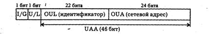 Следующие 22 разряда кода называются OUI (Organizationally Unique Identifier) - организационно уникальный идентификатор. IEEE присваивает один или несколько OUI каждому производителю сетевых адаптеров. Это позволяет исключить совпадения адресов адаптеров от разных производителей. Всего возможно свыше 4 миллионов разных OUI. Вместе OUA и OUI называются UAA (Universally Administered Address) - универсально управляемый адрес или IEEE-адрес.
