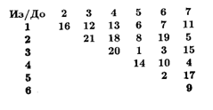 Эта матрица верхняя треугольная, поскольку стоимость проезда между городами i и j одинакова в обоих направлениях. Еели бы мы выписали все стоимости, то нижний треугольник матрицы попросту совпал бы с верхним. Использование верхнетреугольной матрицы позволяет упростить трассировку алгоритма.