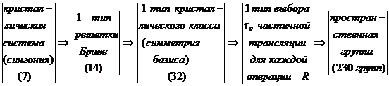 Если базис состоит не из одной молекулы и не обладает никакой симметрией, то можно ожидать, что кристалл будет принадлежать к триклинной сингонии и решетка относится к классу C1, а пространственная группа является самой простой - примитивная решетка P и отсутствие элементов симметрии - такая пространственная группа обозначается C11-P1. Если базис имеет центр инверсии, т. е. симметрию Ci , то структура будет относится к триклинной сингонии, но кристаллический класс будет иметь центр инверсии. Таким образом, кристаллический класс будет Ci, а пространственная группа Ci1-P1. Итак, пространственная группа получается последовательным выбором одной кристаллической системы (сингонии), одного типа решетки Браве, одного типа кристаллического класса и одного типа частичных трансляций tR для каждого элемента симметрии.