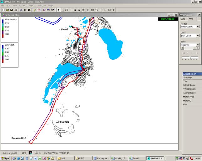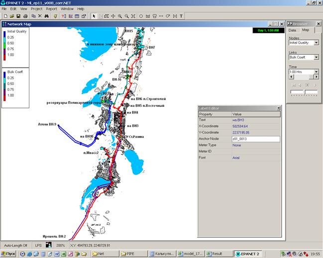 На отработанной модели был проведен анализ возможных мероприятий по совершенствованию работы СПРВ г. Миасс. Отработка проводилась на основе сценария работы системы на 17 июня 2011 г. Поскольку детальных графиков работы элементов системы получить не удалось, расчеты проводились исходя из среднесуточных нагрузок по представленным данным. Это является оправданным, ввиду достаточно равномерной работы основных источников (ВН-2 (Иремель) и ВН-9 (Атлян).