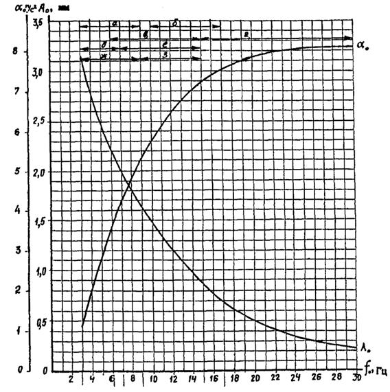 Зависимость вертикальных смещений Ао и ускорений aо от частоты колебаний грунта fо: