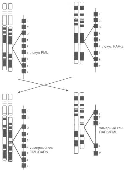 В результате t (15; 17) транслокации нормальная линейная структура хромосом не нарушается, поэтому центромера-теломерная транскрипционная ориентация как PML-, так и RARa-локусов сохраняется: 5I -- 3I [19]. В связи с этим в химерном гене PML/RARa как локус PML, так и локус RARa сливаются в конфигурации "голова-хвост", поэтому транскрипция химерного гена находится под контролем PML-промотоpa.