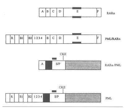 Молекула RARa содержит 6 доменов, обозначенных A, В, С, D, Е и F. Поскольку при транслокации t (15; 17) точка разрыва хромосомы 17 всегда локализуется во 2-м интроне рецептора RARa, то во всех случаях APL в состав химерного белка входят одни и те же домены: от B до F [17]. Иными словами, химерный белок PML/RARa всегда содержит домены RAR, отвечающие за связывание с лигандами, димеризацию, связывание с ДНК.