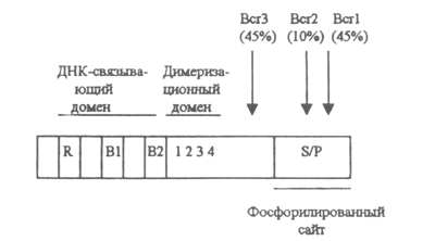 Принципиальная структура PML-белка представлена на рис 2. PML-белок относится к семейству белков, в N-конце которых содержатся кольцевые структуры (zing finger) – С3НС4 [5], а также два цистеин-богатых домена (В-боксы) и димеризационный домен. PML является фосфопротеином и, как показали Z. Mu и соавт. [6], по крайней мере в одном сайте фосфорилируется тирозин/киназой. Функциональные домены PML, входящие в состав PML-RARa химерного белка, представляют собой отдельные цистеинсодержащие последовательности, обозначаемые как пальцевые структуры (Ring finger motif). Функциональные домены PML насчитывают более 40 белков, некоторые из них регулируют экспрессию генов [7].
