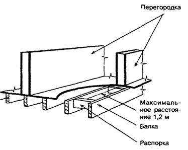 6.3.1 Перегородки должны опираться на черный пол. Перегородка, располагаемая параллельно балкам перекрытия, но между ними, должна через черный пол опираться на деревянные распорки между балками (рисунок 6.13).