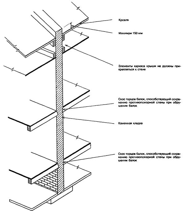 7.4.2 При каменных стенах выполнение требования 7.4.1 достигается за счет того, что прогоны или балки перекрытия, опирающиеся с обеих сторон на стену, не соединяются между собой. По их концам должны устраиваться скосы, предотвращающие разрушение стены при обрушении балок или прогонов (рисунок 7.5).