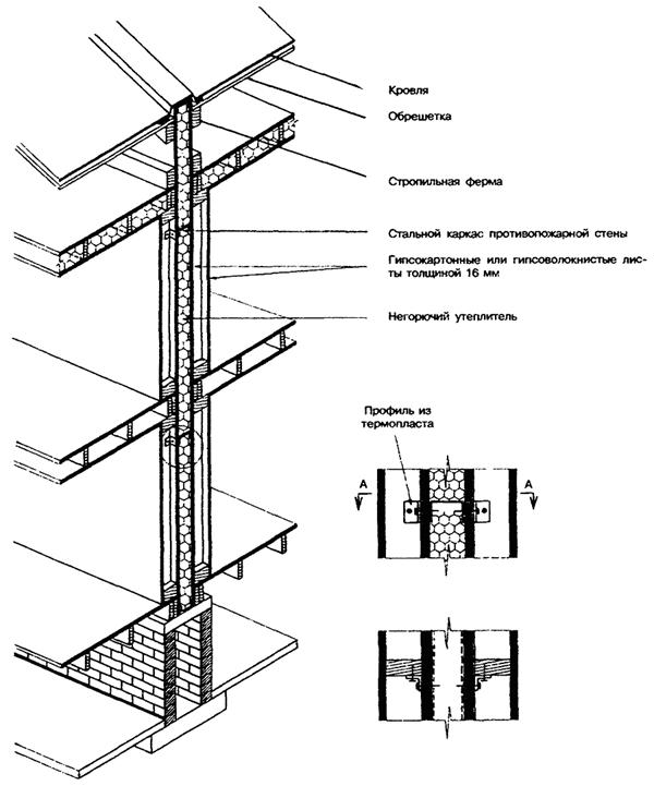 Связь между противопожарной стеной и каркасами смежных блоков осуществляется самонарезающими винтами через дискретные легкоплавкие элементы, например, в виде отрезка профиля из термопласта. Число таких связей должно быть достаточным, чтобы обеспечить устойчивость стены в процессе строительства и после обрушения каркаса одного из блоков при пожаре.