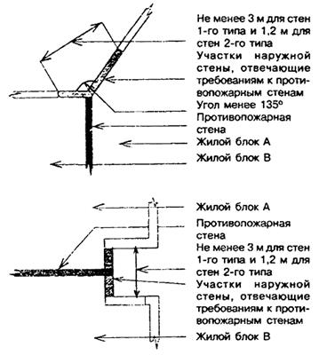 7.4.5 В случаях, когда противопожарная стена разделяет пожарные отсеки или жилые блоки, наружные стены которых находятся под углом 135° и менее, участки наружных стен, образующие этот угол, общей длиной 1,2 м для смежных жилых блоков и 3,0 м для смежных пожарных отсеков должны (независимо от этажности дома) иметь предел огнестойкости и класс пожарной опасности не ниже требуемых для соответствующей противопожарной стены (рисунок 7.7).