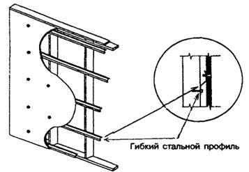 а) обшивку каркаса крепить к гибким стальным профилям (см. пример на рисунке 7.8);