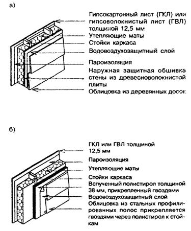 а - утеплитель между стойками каркаса стены; б - утеплитель между стойками каркаса стены с дополнительным слоем жесткого утеплителя снаружи
