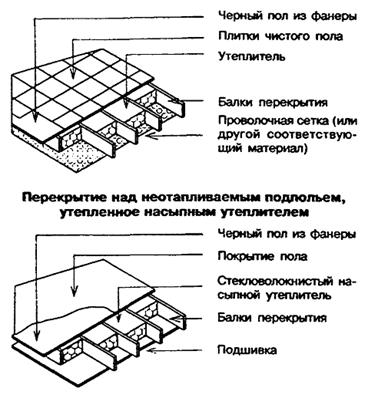 9.2.2.5 В междуэтажных перекрытиях и в перекрытии над неотапливаемым подвалом или подпольем рекомендуется использовать утепляющие материалы в виде плит или матов. В перекрытии над неотапливаемым подвалом или подпольем и в чердачном перекрытии могут использоваться также насыпные утепляющие материалы. Примеры утепления перекрытий приведены на рисунке 9.3.