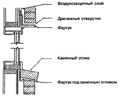 10.3.5.7 Фартуки под наружными отливами окон и над оконными (дверными) проемами в стенах с каменной облицовкой следует размещать от наружной поверхности облицовки в глубь конструкции и отгибать вверх за отлив окна или за перемычку, поддерживающую часть облицовки над проемом.