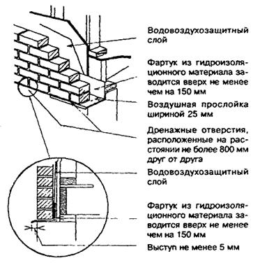 10.3.5.12 При кладке каменной облицовки необходимо следить за тем, чтобы упавший в воздушную прослойку раствор не образовывал мостиков между облицовкой и обшивкой стен, позволяющих просочившейся воде проникать внутрь помещений.
