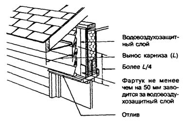 10.4.2.3 Фартук внутри стены должен быть загнут вверх за наружную защитную обшивку каркаса не менее чем на 50 мм, а на внешней стороне стены иметь свес, служащий капельником.
