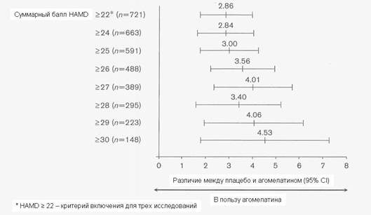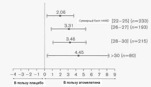 Дополнительный анализ связи между инициальным уровнем тяжести депрессии и терапевтическим эффектом был предпринят для оценки четырех отдельных подгрупп пациентов, выделенных по принципу увеличения стартового суммарного балла HAMD: 22-25, 26-27, 28-30 и более 30 баллов. Три подгруппы со стартовыми баллами HAMD от 22 до 30 были примерно одинаковыми по объему, четвертая подгруппа с баллом HAMD более 30 была меньше. Различие в финальных суммарных баллах HAMD (LOCF) между агомелатином и плацебо рассчитывались к каждой подгруппе методом ковариационного анализа. Проводился взвешенный регрессионный анализ с включением различий в терапии в качестве зависимых переменных и средних стартовых баллов HAMD в пределах каждого интервала в качестве независимых переменных. Нагрузки представляли собой инверсию расчетных вариант (квадраты SE) терапевтического эффекта.
