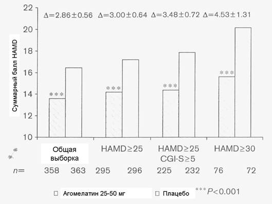 Эффективность агомелатина при тяжелой депрессии оценивалась в трех плацебо-контролируемых исследованиях и анализе объединенных данных всех трех исследований у пациентов, получавших 25-50 мг агомелатина (n = 357) и плацебо (n = 360). Агомелатин достоверно превосходил по эффективности плацебо в подгруппе пациентов с тяжелой депрессией по критерию суммарного балла ≥ 25 по 17-пунктовой Шкале депрессии Гамильтона, как в каждом исследовании отдельно (P<0.05), так и по результатам анализа объединенных данных (P< 0.001). Результаты анализа объединенных данных свидетельствуют об увеличении различий между агомелатином и плацебо по мере нарастания исходной тяжести депрессии по критерию стартового балла Шкалы депрессии Гамильтона. После разделения всей выборки на подгруппы по разным граничным критериям тяжести с увеличением стартовых суммарных баллов Шкалы депрессии Гамильтона достоверное превосходство агомелатина над плацебо выявлено во всех подгруппах, даже несмотря на уменьшение числа пациентов при увеличении тяжести. Нарастание6 исходной тяжести депрессии сопровождалось увеличением различий между агомелатином и плацебо от 2.06 до 4.45 баллов по Шкале депрессии Гамильтона. Таким образом агомелатин является эффективным средством терапии тяжелой депрессии.