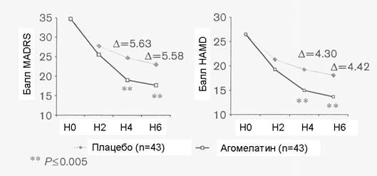 Различия между плацебо и агомелатином 25 мг в финальных суммарных баллах MADRS и HAMD в подгруппе пациентов со стартовым суммарным баллом MADRS ≥ 30 в сочетании со стартовым баллом CGI-S ≥ 5 были достоверными на 4 и 6 неделях терапии (Рисунок 4).