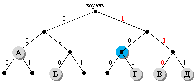 1) построим двоичное дерево, в котором от каждого узла отходит две ветки, соответствующие выбору следующей цифры кода – 0 или 1; разместим на этом дереве буквы А, Б, В, Г и Д так, чтобы их код получался как последовательность чисел на рёбрах, составляющих путь от корня до данной буквы (красным цветом выделен код буквы В – 011):