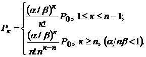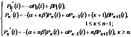 В словесной формулировке это звучит так: вероятность того, что в момент времени (t+Dt) в системе находится к требований (k £ n – 1) равна вероятности того, что в момент t в системе находилось к требований и ни одного требования не поступило и не было обслужено, плюс вероятность того, что в момент времени t в системе находилось (k-1) требование и за время Dt поступило одно требование в систему, плюс вероятность того, что в момент времени t в системе находилось (k+1) требование на обслуживании и за время Dt одно из (k+1) требований было обслужено, плюс вероятность того, что за время Dt произошло более одного события.
