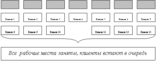 Если поступивший клиент застает на СТО весь рабочий персонал занятым, то он встает в очередь и ждет до тех пор, пока не освободится рабочее место.