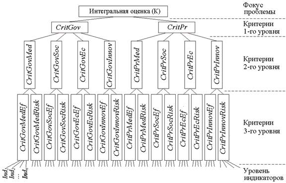 Использование подхода метода анализа иерархий (МАИ) позволяет построить иерархию рассмотренных критериев и соответствующих им индикаторов (рисунок 1). После этого оценка проекта вычисляется в виде аддитивной линейной многоуровневой сверстки индикаторов, где весовые коэффициенты, отражающие относительную значимость индикаторов и критериев (в пределах своих уровней) определяются на основе обработки экспертных суждений с использованием метода парных сравнений [4]..