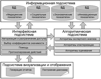 - информационная подсистема состоит из баз данных, содержащих информацию о медицинских, социальных, экономических, инновационных показателей,