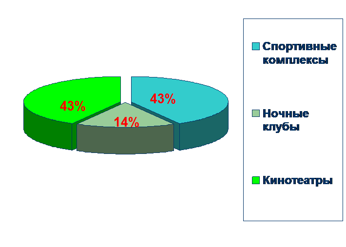 По результатам опроса (Приложение ) я сделала вывод, что молодым специалистам для проведения своего свободного времени необходимы: спортивные комплексы - 43%, ночные танцевальные клубы - 14%, кинотеатры, оборудованные по современным технологиям – 43%.