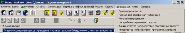 1. Для удобства работы Пользователей, вызов любого приложения, входящего в состав программных средств АСВКБ, можно производить либо из пункта меню Приложения главного меню приложения Валютный контроль, либо выбрав на инструментальной панели кнопку (значок), с названием приложения. См. Рисунок.