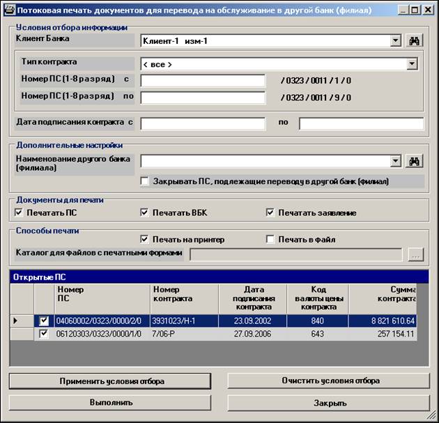 6. В пункте главного меню Сервис добавлен новый пункт Потоковая печать документов для перевода на обслуживание в другой банк (филиал банка)