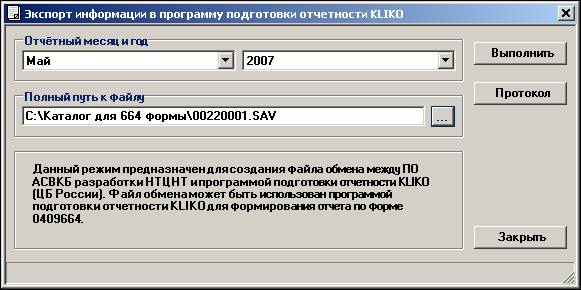 8. В пункте меню Отчеты è Форма 0409664 добавлен новый пункт Экспорт информации в программу подготовки отчетности KLIKO. Данный пункт меню (режим) предназначен для создания файла обмена между ПО АСВКБ разработки НТЦНТ и программой подготовки отчетности KLIKO (ЦБ России). Файл обмена может быть использован программой подготовки отчетности KLIKO для формирования отчета по форме 0409664.