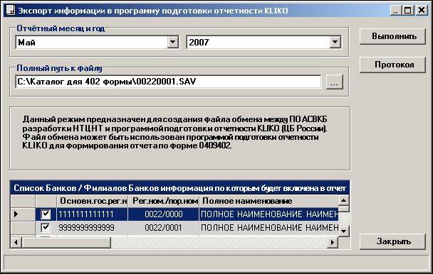 - Экспорт информации в программу подготовки отчетности KLIKO. Данный пункт меню (режим) предназначен для создания файла обмена между ПО АСВКБ разработки НТЦНТ и программой подготовки отчетности KLIKO (ЦБ России). Файл обмена может быть использован программой подготовки отчетности KLIKO для формирования отчета по форме 0409402. Для формирования файла обмена необходимо выбрать отчетный период, в окне Полный путь к файлу указать полный путь к файлу, отметить список Банков/филиалов Банков информация по которым, будет включена в отчет, нажать кнопку Выполнить. Для просмотра результатов формирования файла обмена, с именем рег. номер банка. SAV, нажмите на кнопку Протокол. См. рисунок и описание изменений в Приложении Настройка программных средств;
