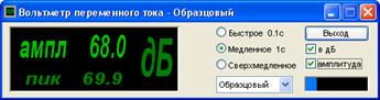 Запускают программу «Вольтметр переменного тока» из меню «Измерение» панели ZETLab, настраивают ее на отображение амплитудного значения в децибелах с усреднением данных 1 с и выбирают канал подключения образцового датчика (Рисунок 5.2).