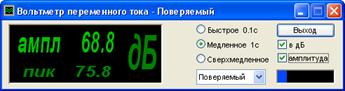 Запускают следующую программу «Вольтметр переменного тока», настраивают ее на отображение амплитудного значения в децибелах с усреднением данных 1 с и выбирают канал подключения поверяемого датчика (Рисунок 5.3).