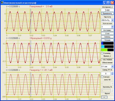 Запускают программу «Многоканальный Осциллограф» из меню «Отображение» панели ZETLab, включают 3 окна отображения. В первом окне выбирают канал поверяемого ВИП, во втором - образцового датчика, в третьем – виртуальный канал генератора (Рисунок 5.4).