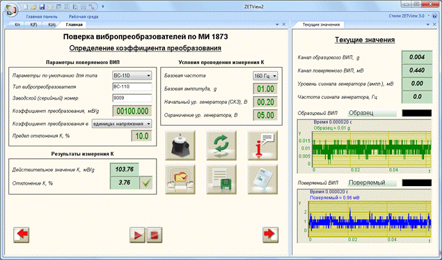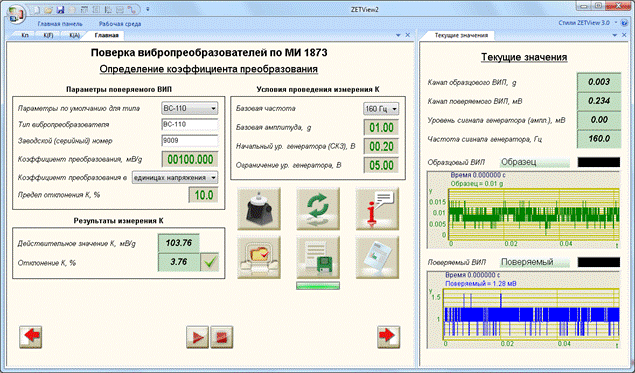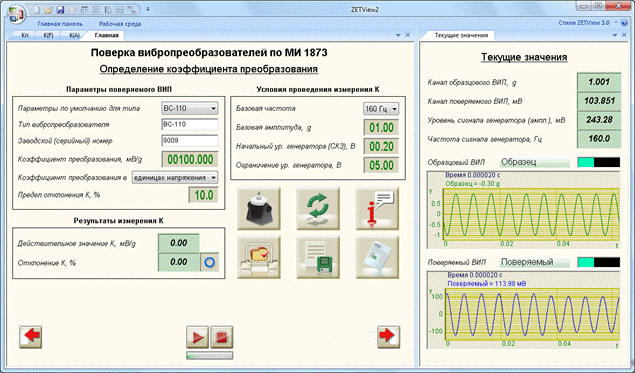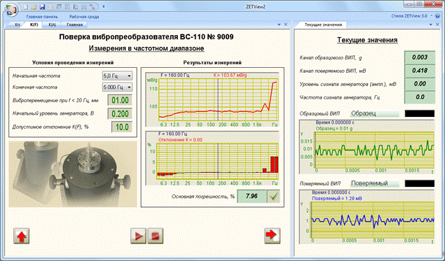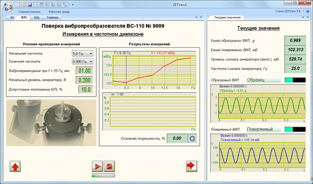 ). При этом под кнопками «Старт» и «Стоп» отобразится индикатор процесса, а на вкладке «Текущие значения» отобразятся показания вольтметров по образцовому и измерительному каналам, напряжение и частота генератора, осциллограммы и интегральные уровни сигналов с вибропреобразователей (Рисунок 6.4).